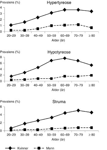 Hypotyreose. Lavt stoffskifte eller hypotyreose var tidligere påvist hos 4,8 % av kvinnene og 0,9 % av mennene, og prevalensen økte med alder (tab 2, fig 1). 7,5 % av kvinnene i alderen 60 – 69 år hadde tidligere fått påvist hypotyreose. I tabell 2 ser vi at 5,0 % av kvinnene og 1,0 % av mennene brukte eller hadde brukt tyroksin, dvs. noen flere enn dem som hadde fått påvist hypotyreose.