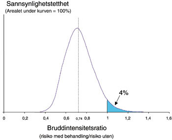 Figur 1 viser den beregnede usikkerheten for bruddintensitetsratio knyttet til dette materialet. Usikkerheten er gitt ved en sannsynlighetsfordeling. (Mer presist er dette en sannsynlighetstetthet der arealet under kurven er lik 1. Denne tettheten kan oppfattes som en standardisert rimelighetsfunksjon.) Vi ser at tettheten er størst svarende til 26 % bedring av hyppigheten av vertebralfrakturer hos en pasientgruppe som fikk didronat sammenliknet med en kontrollgruppe. Dette tallet (26 %) er et punktestimat på bedringen og svarer omtrent til det vi ville vente ut fra tidligere informasjon. Vi ser imidlertid at det skraverte området til høyre på figuren utgjør 4 % av arealet under kurven, mens 96 % av arealet under kurven ligger til venstre for tallet 1. Dette betyr at sannsynligheten for at bruddintensitetsratioen er mindre enn 1 og dermed at didronat hjelper, blir 96 %. P-verdien ble beregnet til 8 %. Den amerikanske legemiddelkontrollen feiltolket dette og aksepterte ikke didronat ved osteoporose. Nå har vi imidlertid akkurat lært at en p-verdi ikke sier noe om hvorvidt en observasjon (26 % reduksjon) er sann eller ikke, og vi vil derfor være åpne for å trekke en annen konklusjon.