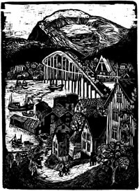 Ta med deg bildet og gå en tur i byen og prøv å gjenfinne motivet. Du finner det bare nesten. For her kommer kunstnerens hånd inn: Linjene fra fjellet gjenfinnes i broen og går igjen i bildet også andre steder. En melodi er understreket som nok er der i virkeligheten, men langt fra så tydelig. Men det ser vi ikke, for det kunstneren har tilført, gjør at effekten som markør bare forsterkes. Den som har Tidsskriftet med tresnittet i hånden, har en off-site marker som virkningsfullt ønsker velkommen til Tromsø og forteller om hva som skal sees, hva byen er og hva den står for. Kunstverket er ikke ”sant” i forhold til virkeligheten, men det er ”sant” med henblikk på budskapet.