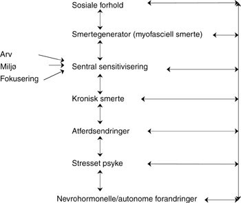 Utvikling av kronisk smerte er en dynamisk prosess som bl.a. innebærer nevrofysiologisk smerteregulering og læring samt kognitive, emosjonelle og atferdsmessige forhold (27). Diskusjonen om fibromyalgiårsaken enten sitter i kroppen eller i psyken vil derfor aldri føre frem. Syndromet kan best forståes som en biopsykososial lidelse der både biologiske, psykologiske og sosiale forhold bidrar til å utløse og opprettholde det (28). Nøkkelelementene (13, 29) blir kort referert nedenfor.