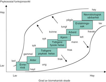 Moderne psykosomatisk tenkning legger til grunn at predisponerende psykologiske og somatiske sårbarhetsfaktorer samvirker med utløsende faktorer og symptom- og funksjonsmodererende faktorer i utformingen av et sykdomsforløp, og en psykosomatisk modell for forløpet av nakkeskade med whiplashmekanisme er presentert i figur 1.