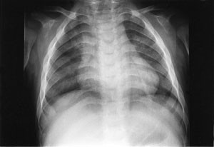 Pasienten ble så 13 måneder gammel innlagt i barneavdeling i forbindelse med ny feberepisode. Ved innleggelsen var han dystrofisk, med stor abdomen, tynne ekstremiteter og slunkne nates. Noe grove ansiktstrekk ble bemerket, men gav ikke umiddelbart videre assosiasjoner. Utredning av malabsorpsjon med tanke på cøliaki ble startet. Metabolsk screening av urin og serum ble rekvirert. Røntgen thorax viste klare lunger og et normalt stort hjerte, men påfallende brede costae (fig 1). Fysioterapeutisk vurdering bemerket en forsinket motorisk utvikling og stive ledd. Øre-nese-hals-undersøkelse viste betydelig nasalstenose og hypertrofiske tonsiller. Foreldrene kunne fortelle om uttalt pustebesvær og sterk snorking om natten, med tendens til pustestopp. Primær malabsorpsjon og cøliaki ble utelukket med serologiske prøver. Ultralyd abdomen viste leverstørrelse i øvre normalområde.