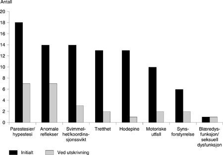 18 dykkere hadde parestesier/hypestesi initialt. I tillegg var anomale reflekser, svimmelhet, tretthet, hodepine og motoriske utfall vanlig. Parestesier/hypestesi og anomale reflekser var hyppigste sekvele (fig 1). 11 dykkere hadde vedvarende symptomer. Fem responderte dårlig på behandling, med klinisk sluttskåre på 50 % eller mer av initial klinisk skåre. Alle fem hadde dykket daglig i to eller flere dager. Dette var tilfellet bare hos halvparten av de øvrige. Median alder var 29 år, mot 23 år hos de øvrige. Median dybde var 35,0 m, mot 26,1 m hos de øvrige. Asymmetriske plantarreflekser ble sett hos fem dykkere som alle hadde vedvarende symptomer. Fire dykkere hadde dykket dypere enn 35 m. Disse hadde mer uttalte symptomer etter behandling enn 13 dykkere med grunnere dykk (median skåre 4,5 mot 0).