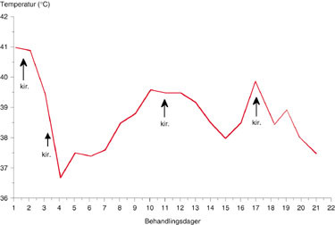 Postoperativt var pasienten septisk med temperatur omkring 41 o C (fig 1). Røntgen thorax viste bilaterale lungefortetninger som ved akutt respirasjonssviktsyndrom (ARDS). Sirkulasjonssvikt og respirasjonssvikt gjorde det nødvendig med vasopressorbehandling og respiratorbehandling med 100 % O₂ og respiratoriske trykk på opptil 39 cm vann med positivt endeekspiratorisk trykk (PEEP) på 10 cm vann. Initialt ble pasienten behandlet med dopamin inntil 10 g/kg/min i kombinasjon med noradrenalin i doser opptil 0,4 g/kg/min. Senere ble dopamin erstattet med adrenalin, og vasopressorbehandlingen kunne etter hvert reduseres. Pasienten fikk 15 l væske det første døgnet. Kreatininnivået var 204 ved ankomst og steg ytterligere. Da det oppstod anuri startet man opp med kontinuerlig hemodiafiltrasjon (PRISMA), som igjen kunne avsluttes etter tre døgns behandling. CRP falt første døgnet fra 625 til 329 mg/ml, men steg igjen til over 400 mg/ml (fig 2). Enzymverdiene steg de nærmeste dagene og hadde et muskelnekrosemønster, med CK på over 13 000 U/l og ASAT på 2 650 U/l (fig 2). ALAT, gamma-GT og bilirubin var stort sett normale.