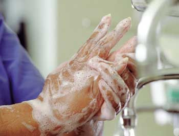 – De kan velge mellom tradisjonell håndvask i tre minutter eller tre minutters desinfisering med en oppløsning av klorheksidin og etanol. Det siste forutsetter at man har vasket hendene grundig med såpe minst én gang ved begynnelsen av dagen, og at man ikke er synlig tilsmusset på hendene. Er man blitt skitten, holder det ikke med spritvask. Da må kirurgen vaske seg igjen.