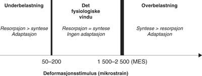 Ved mekanisk overbelastning vil det utløses en respons som øker både masse og styrke av muskel og bein. Deformasjon over terskelverdien, f.eks. over 1 500 – 2 000 mikrostrain (størrelsene er basert på Frosts spekulasjoner), vil altså medføre en positiv respons som fører til økt beinmasse (en mikrostrain = en mikrometer deformasjon per meter lengde. 1 000 mikrostrain tilsvarer 20 megapascal (mPa) eller to kg/mm²) (13). Det betyr at beinsyntesen vil være større enn resorpsjonen (fig 1) (11). Hvis det forekommer en vedvarende underbelastning, som ved sengeleie eller vektløshet, vil muskel- og beinmassen reduseres til et nivå som tilsvarer den mindre belastningen. Ved deformasjon under terskelverdiområdet, f.eks. under 200 mikrostrain, vil beinresorpsjonen være større enn beinsyntesen (fig 1). Mellom disse ytterpunktene finner vi det såkalte fysiologiske vinduet (fig 1), med størrelser på deformasjonen som ikke vil produsere noen respons (beinresorpsjonen = beinsyntesen) (12).