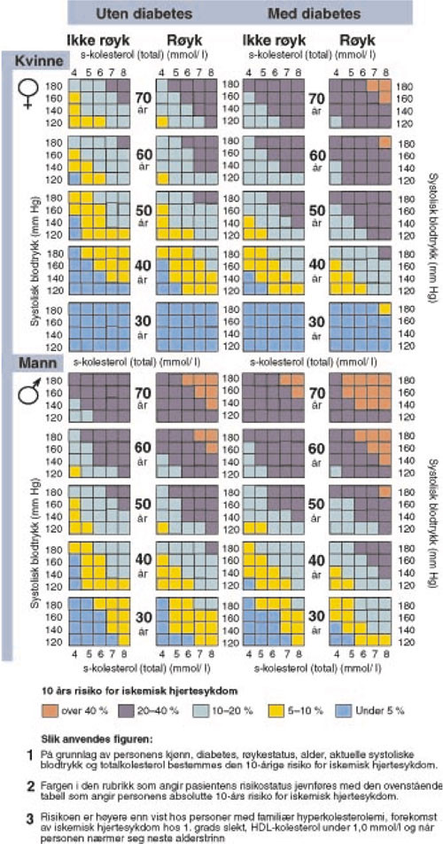Personer med etablert hjerte- og karsykdom, som angina pectoris, perifer aterosklerose og gjennomgått infarkt eller slag, regnes alltid som høyrisikopersoner. De vanlige tabellene for risikoberegning kan ikke brukes på disse pasientene.