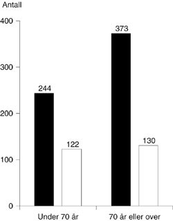 Figur 1 viser at det var flere menn over enn under 70 år, mens det for kvinner var liten forskjell.