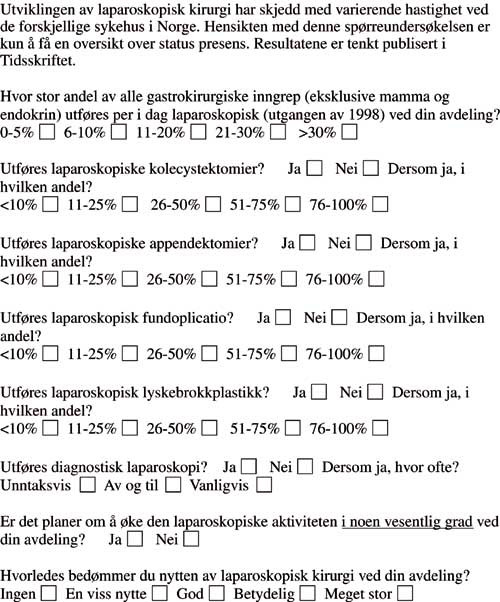 For å kartlegge hvordan laparoskopisk kirurgi blir praktisert i Norge ble det i januar 1999 sendt ut et spørreskjema (fig 1) til alle kirurgiske avdelinger (n = 59) ved offentlige sykehus hvor man formodet at denne virksomheten foregikk. Etter purring i løpet av to måneder med nytt skjema eller telefonkontakt hadde svar kommet fra 58 sykehus. Utgangsmaterialet for videre analyse var 54 av disse sykehusene hvor laparoskopisk kirurgi ble utført. Disse sykehusene er inndelt slik, ifølge Helsedepartementet: regionsykehus (n = 5), sentralsykehus (n = 13) og lokal/fylkessykehus (n = 36).