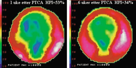 De siste ti årene har man diskutert om primær angioplastikk gir bedre resultater enn trombolytisk behandling ved akutt hjerteinfarkt. Flere internasjonale studier har vist bedre overlevelse, men også høyere global ejeksjonsfraksjon (EF) hos pasienter behandlet med primær angioplastikk sammenliknet med pasienter som har fått trombolytisk behandling (1 – 5). I de fleste studiene har man imidlertid undersøkt ejeksjonsfraksjonen ved utskrivningstidspunktet, og lite er kjent om venstre ventrikkel-funksjonen etter lengre tids oppfølging. Lite er også kjent om endringer i infarktstørrelsen etter behandling med primær angioplastikk. Den høye grad av reperfusjon som oppnås ved primær angioplastikk, antas å påvirke infarktstørrelsen over tid via mekansimer som remodellering og gradvis oppheving av stunning/hibernering (6, 7).