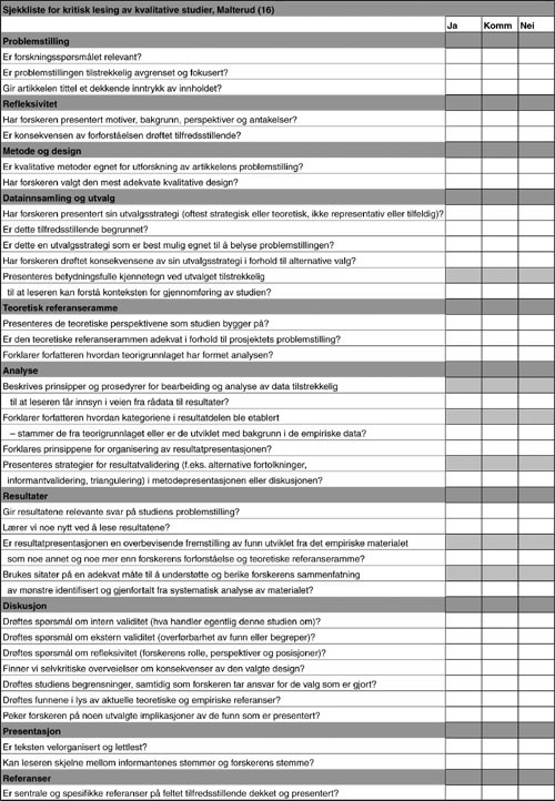 Mays N, Pope C. Quality in qualitative health research. I: Pope CP, Mays N, red. Qualitative research in health care. 2. utg. London: BMJ Books, 2000: 89 – 101.