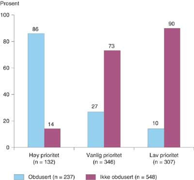 17 % ble «høyprioritert», 44 % ble «vanlig prioritert» og 39 % ble «lavprioritert» av rekvirenten. Av de «høyprioriterte» ble 86 % obdusert, av de «vanlig prioriterte» ble 27 % obdusert, mens av de «lavprioriterte» ble kun 10 % obdusert (fig 1). Av dem som ble obdusert, var 48 % høyt prioritert av rekvirenten. Gjennomsnittsalder for de høyprioriterte var 71,2 år, og henholdsvis 75,0 år og 74,6 år (p = 0,019) for pasientene med vanlig og lav prioritet (tab 1). Gjennomsnittsalder for de obduserte var 71,6 år, for de ikke-obduserte 75,3 år (p < 0,001) (tab 1). Av menn ble 18 % høyprioritert, tilsvarende 15 % for kvinner (ikke signifikant). 32 % av mennene ble obdusert og 28 % av kvinnene (ikke signifikant).