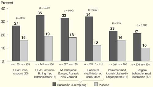 Studiene viser at bupropion er effektivt i ulike settinger, hos røykere med eller uten sykdom og med høy eller lav avhengighetsskåre. Deltakere med røykerelatert sykdom var eldre enn friske deltakere; i alle studiene ble personer ³ 18 år inkludert. Andelen kvinner og menn var jevnstor i studiene. Gjennomsnittlig antall sigaretter/dag var > 20 i alle studiene, men i den multinasjonale studien og i studien blant pasienter med hjerte- og karsykdom var grensen for inklusjon ³ 10 sigaretter/dag. Deltakere i de amerikanske studiene og pasientene med kronisk obstruktiv lungesykdom hadde noe høyere avhengighetsskåre enn deltakere i den multinasjonale studien og pasienter med hjerte- og karsykdom. Frafallsprosenten er, som i alle røykeavvenningsstudier, høy, og den er større hos deltakere som får placebo, sannsynligvis pga manglende effekt. Intention-to-treat-analysene gir da noe høyere oddsratioer enn hvis kun de med oppfølgingsdata inkluderes i analysene. Frafallsprosenten pga. bivirkninger var lav i begge gruppene.