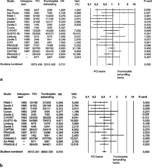 Fem av de randomiserte studiene hadde en transportarm (tab 3). Både i DANAMI-2, PRAGUE og PRAGUE-2 (de største studiene) var det kombinerte endepunktet død, reinfarkt og slag etter 30 dager signifikant i favør av angioplastikk.
