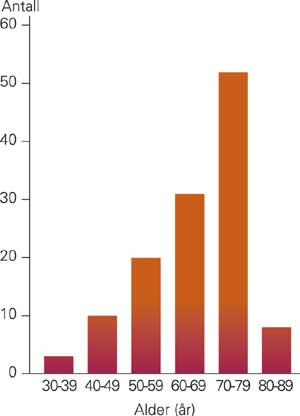 Det var 87 kvinner (70 %) og 37 menn (30 %). Gjennomsnittsalder ved operasjon var 66 år; 67 år for kvinner og 64 år for menn (spredning 33 – 83 år) (fig 1). Det var 13 pasienter under 50 år og 60 over 70 år. Ved primær artrose var gjennomsnittsalderen 72 år, ved sekundær artrose 55 år.