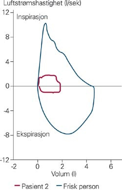 Ved trakeal obstruksjon viser hastighet-volum-kurven et tilnærmet platå av ekspiratorisk toppstrømshastighet i den tidlige delen av ekspirasjonen (fig 2), i motsetning til den fallende kurven man ser hos friske mennesker (fig 1).