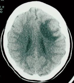Laboratorieprøver viste Hb 9,5, hvite blodceller 7,6, CRP 29, SR 36. Elektrolytter, blodsukker, lever- og nyrefunksjonsprøver var normale. HIV-test negativ. CT caput (fig 1) viste 2 cm stor kontrastoppladende ringlesjon med ødem frontotemporalt på venstre side. Man mistenkte tumor, eventuelt abscess, og det ble startet behandling med antibiotika, fenytoin og deksametason.