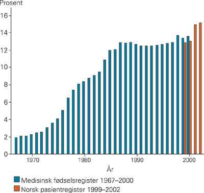 Figur 1 viser keisersnittsratene i Norge fra 1967 til 2002. Tallene er hentet fra Medisinsk fødselsregisters årsmeldinger (1), i tillegg er ratene fra Norsk pasientregister (tab 2) gjengitt. I de første åtte måneder av 2002 var det 15,1 % keisersnitt. Økningen fra 2000 til 2001 er betydelig.