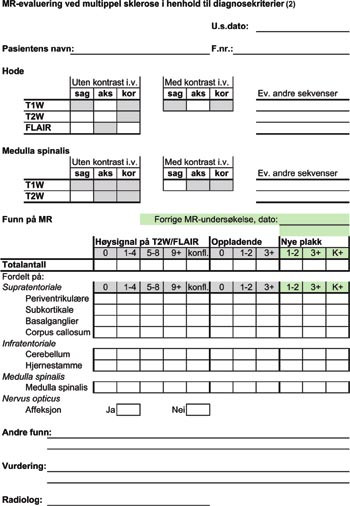Undersøkelserapportering skjer i dag som en ordinær radiologisk beskrivelse. For å kunne besvare best mulig i henhold til diagnosekriteriene (tab 2) og komme til en radiologisk konklusjon, har vi utarbeidet et rapportskjema (e-fig 1) som kan følge pasientene. Dette kan eventuelt legges inn i sykehusets/instituttets røntgeninformasjonssystem. Vi mener dette vil gjøre det lettere å vurdere MR-funn i henhold til de diagnostiske kriteriene. Skjemaet gir plass for en konklusjon i forhold til disse samt mulighet til å anbefale tid for eventuell kontrollundersøkelse. Det vil også kunne tjene som en del av grunnlaget for registrering av pasienter i det nasjonale multippel skleroseregisteret i Norge. Skjemaet kan danne grunnlag for rapportering og forskning. Den radiologiske beskrivelsen kan gjøres på vanlig måte eller utformes som en del av rapportskjemaet dersom radiologen finner dette riktig.