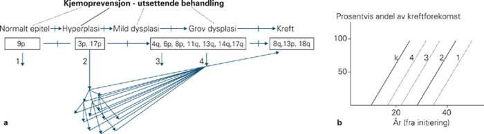 En annen kreftforebyggende strategi ville være å identifisere høyrisikopersoner (14, 15) og behandle dem aktivt dersom det foreligger markører for høy kreftrisiko (16). Det grunnleggende prinsipp bak kjemoprevensjon er at kreft utvikles i flere trinn og er multifokal (4), og at viktige molekylære markører identifiseres tidlig, slik at man ved behandling kan forebygge kreftutvikling (fig 1). National Cancer Institute (NCI) i USA fikk for om lag 20 år siden en egen avdeling som utelukkende arbeider med kjemoprevensjon, og om lag 100 kliniske studier med primær kjemoprevensjon som siktemål er i gang i regi av instituttet. På den annen side er det påfallende at manualen til EORTC (European Organization for Research and Treatment of Cancer) for 2002 (Organization Activities and Current Research 1962 – 2002: 40 years of excellence in developing new standards of cancer care) ikke omtaler noen aktuelle studier innen kjemoprevensjon.