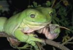En frosk med det engelske navn Dumpy treefrog (Pelodryas caerulea) tar livet med ro etter et tilfredsstillende måltid. Den er et bilde på sommerferien slik mange ønsker den, med god mat, eksotiske reisemål og naturopplevelser. Men som forsideportrett skylder vi den en presentasjon. Dette er en stor frosk, opptil 11 cm lang, beskrevet i ca. 1770 under James Cooks utforskning av Australia. Hovednæringen er insekter, larver og smådyr. Når tilgangen på mat er god, har den en tykk hudfold over øynene og ned langs siden av forkroppen. Særlig hunnen kan bli temmelig korpulent slik at hudfolden dekker de to tympaniske membraner. Fordi hannens paringskvekk kan komme opp i 90 dB, kan det kanskje være en fordel (1) . At hunnen er størst, kan også komme godt med, siden den risikerer å måtte bære hannen på ryggen i opptil to døgn. Paringen foregår på grunt, stillestående vann, og er av til dels eksplosiv natur. Hunnen kan skyte eggene gjennom en gel med spermier og videre en halv meter utover i vannet. De befruktede eggene synker til bunns. Ellers tilbringer denne frosken det meste av tiden i høye trær. Den har evnen til å øke vanninnholdet i hud og underhud, en oppgave kosmetikkindustrien ikke har klart. I tørkeperioder kan den dekke huden med et voksaktig lag som motvirker væsketap. Et sekret fra huden er effektivt mot gule stafylokokker. Dumpy treefrog ser ut til å klare seg bra, noe som ikke er en selvfølge.