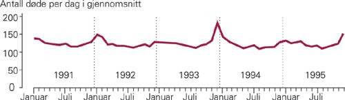 For perioden var det totale antall døde, menn og kvinner samlet, i gjennomsnitt 123,5 per dag. For vinterhalvåret (november til april) var tallet 130,6 og for sommeren 116,4 – det vil si 12 % flere dødsfall om vinteren. Forskjellen mellom de midterste vinter- og sommermånedene var større. Det er tre topper i perioden – i begynnelsen av 1992, i slutten av 1993 og i slutten av 1995 (fig 1). Vi laget en tilsvarende figur for hver enkelt landsdel og benyttet uke i stedet for måned som skala (ikke vist). Forløpet var ensartet, men toppene ble nådd senere i Trøndelag og særlig i Nord-Norge.