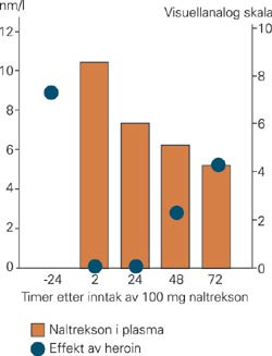 Naltrekson ble først fremstilt i 1963. Det er et syntetisk opioid med tilnærmet ren antagonistisk effekt. Det kan altså blokkere virkningen av opioider og hindre effekt av for eksempel heroin (fig 1). Den antagonistiske virkningen er godt dokumentert (2, 3) og reseptoraffiniteten høy. Naltrekson vil derfor i små konsentrasjoner fortrenge høyere konsentrasjoner av agonister som har lavere reseptoraffinitet, slik som morfin og metadon (fig 2). Buprenorfin har en sterk og pseudoirreversibel reseptorbinding. Dersom naltrekson gis først, vil dette forhindre at buprenorfin bindes til reseptoren. Gis derimot buprenorfin først, er den vanskelig å fortrenge selv med høye naltreksondoser (4).