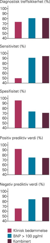 Våre data støtter de nylig utgitte europeiske retningslinjer for diagnostisering og behandling av hjertesvikt, som nevner BNP som en viktig diagnostisk test (23). BNP-måling er et nyttig hjelpemiddel for å stille diagnosen hjertesvikt.