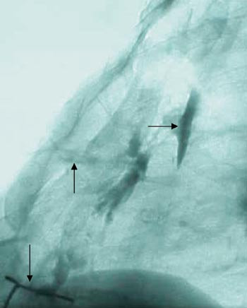 Diagnosen er vanskelig, og hos vår pasient ble den endelig først etter at fistulografi viste kontrast inn til protesen (fig 1). Gjentatte torakale computertomografiundersøkelser viste ingen forandringer fra funnene gjort umiddelbart postoperativt, og verken torakal magnetresonansundersøkelse eller transøsofageal ekkokardiografiundersøkelse var til nytte. Leukocyttscintigrafi viste imidlertid oppladning av radioaktivt merkede leukocytter rundt aortaroten og skjerpet mistanken om proteseinfeksjon. Denne undersøkelsen rapporteres å være positiv i kun 50 % av tilfellene (10). Infeksjon oppstår i de fleste tilfeller i forbindelse med selve innsettingen av protesen (11), men proteseinfeksjon fra tilstøtende infeksjonsfokus eller etter bakteriemi er like sannsynlig hos vår pasient. Pasienten fikk alvorlig septikemi med gule stafylokokker bare fire dager etter innsetting av protesen og således før denne var epitelialiseret. Sternumløsning 14 dager etter sternotomien tydet på hissig osteomyelittisk prosess.