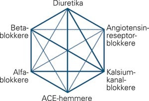 Hva ALLHAT og andre studier har vist oss, er at flere medikamenter er nødvendig for å oppnå god blodtrykkskontroll, dvs. under 140/90 mm Hg og enda lavere for diabetikere eller pasienter med nyreaffeksjon. Forfatterne av ALLHAT poengterer selv nettopp behovet for kombinasjonsbehandling, til tross for den høye diuretikadosen som ble benyttet (8). Det ble brukt mer enn to medikamenter i gjennomsnitt, og blodtrykkskontroll ble ikke oppnådd hos mer enn 35 % av dem som fikk monoterapi. Valget av kombinasjoner i ALLHAT-studien var ulogisk og særlig uheldig for ACE-hemmergruppen, og det favoriserte diuretikagruppen (8). Valg av riktige kombinasjoner er viktig for et godt resultat, noe som også er diskutert tidligere i Tidsskriftet (9) – (11) (fig 1). Så kanskje er diskusjonen om bruk av tiazider eller ikke som førstevalg mindre interessant, siden de aller fleste vil trenge flere medikamenter for å oppnå god blodtrykkskontroll. Dette er særlig tilfellet hos pasienter med mer komplisert hypertensjon, diabetes eller nyreaffeksjon hvor det ikke er uvanlig med tre eller flere medikamenter (12). Blodtrykkspasienter med tegn til målorganskade (som venstre ventrikkel-hypertrofi og albuminuri) bør også behandles med andre medikamenter enn tiazider, men tiazider kan og bør sannsynligvis brukes i kombinasjon (12).