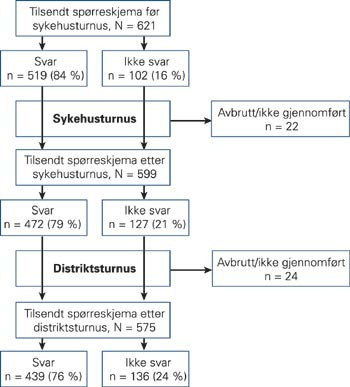 I de to tidligere delene av studien ble det sendt ut et anonymisert spørreskjema til fire kohorter turnusleger før og etter turnustjeneste i norske sykehus påbegynt i perioden juli 1996 – januar 1998. Et tredje og siste spørreskjema som danner utgangspunktet for den foreliggende studien, ble sendt ut mot slutten av turnustjenesten i distrikt. Adresselister ble innhentet fra Fylkeslegen i Oslo, og fordelingen av svar er vist i figur 1. For å undersøke ferdighetsnivået etter avsluttet turnustjeneste inkluderte vi alle turnusleger som svarte etter distriktsturnus. Når det gjaldt utviklingen av ferdighetsnivået gjennom turnustjenesten, undersøkte vi bare dem som svarte både før og etter turnustjeneste i sykehus og i distrikt.