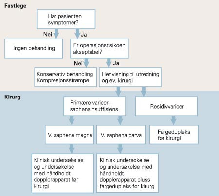 Kirurger som opererer pasienter med venøs insuffisiens, bør samarbeide med radiologisk avdeling eller sirkulasjonslaboratorium med kompetanse på fargedupleksvurdering av klaffesvikt og refluks samt blodstrøm og avløp i underekstremitetsvener. Ved den første konsultasjonen gjøres klinisk undersøkelse med Trendelenburgs test og kartlegging av refluks med håndholdt dopplerapparat. Mens pasienten står, lyttes det etter refluks i saphenastammer samt v. poplitea etter manuell kompresjon av tykkleggen. Hvis man finner refluks i v. saphena magna og ikke refluks i fossa poplitea, og det ikke er residivvaricer etter tidligere kirurgiske inngrep, kan pasienten tilbys kirurgisk behandling uten ytterligere utredning. I motsatt fall, eller ved tvil om tolking av funn, bør det gjøres fargedupleksundersøkelse for å kartlegge overflatiske og dype vener i ekstremiteten. Dette er nødvendig for å utelukke differensialdiagnoser og for å planlegge et ev. inngrep (fig 1). I enkelte tilfeller kan det være nyttig å supplere med ambulatorisk venetrykksmåling (invasiv trykkmåling i vener) eller pletysmografi. Ved dyp venøs insuffisiens hvor man vurderer rekonstruksjon av klaffer i dype vener, kan det også være nødvendig med venografiundersøkelse. Dette betraktes foreløpig som eksperimentell behandling.