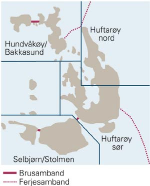 Austevoll består av ni øyar som er busette med folk, til saman ca. 4 450 innbyggjarar. Det er bru mellom dei fleste av dei større øyane (fig 1). Selbjørn og Stolmen er separate øyar bundne saman med Huftarøy ved bru. Hundvåkøy/Bakkasund nordvest i kommunen har ikkje brusamband med resten av kommunen. Huftarøy sør og Huftarøy nord har begge folkekonsentrasjonar, men det er eit visst demografisk/geografisk skille mellom dei ved eit lengre belte med svært tynn folkesetnad som går tvers over øya. Kommunen har to kommunelegekontor (Storebø og Bekkjarvik, respektive nordre og søre del av kommunen), og eit utekontor på Hundvåkøy der det er lege to dagar i veka.