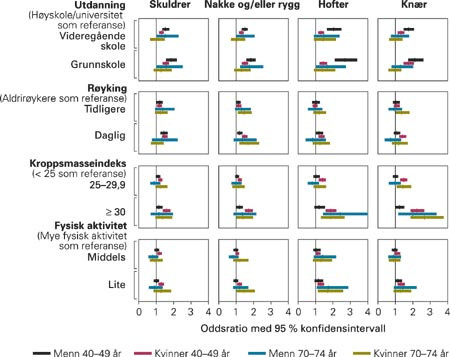 Studiepopulasjonen ble delt inn i to aldersgrupper: 40 – 49 år og 70 – 74 år. I presentasjonen av resultatene vil disse benevnes henholdsvis yngre og eldre. Alder, utdanning, røykevaner, kroppsmasseindeks og fysisk aktivitet ble inkludert i en multivariat logistisk regresjonsanalyse for å studere sammenhengen mellom smerte (både generelt og etter forskjellige kroppsdeler) og overnevnte faktorer. Deltakere med manglende verdier for noen av variablene ble ekskludert fra denne analysen. Oddsratio med 95 % konfidensintervall (KI) og tosidige p-verdier for å teste lineær trend er presentert (15). Multivariat logistisk regresjonsanalyse med interaksjonsledd ble gjennomført for å teste om kjønn var en signifikant effektmodifikator i sammenhengen mellom røykedose og muskel- og skjelettplager. Disse analysene ble justert for alder, utdanning, kroppsmasseindeks (BMI) og fysisk aktivitet. SPSS for Windows 11.0 ble brukt til statistiske beregninger. Tosidig p-verdi mindre enn 0,05 ble regnet som signifikant.