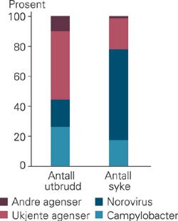 De vanligst isolerte agenser ved utbruddene er Campylobacter og norovirus, men ved mange er etiologien ikke kartlagt