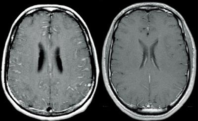 Differensialdiagnoser er cerebrale eller meningeale metastaser og kronisk meningoencefalitt av annen årsak, særlig tuberkuløs meningitt. Ved Hodgkins sykdom er intrakraniale metastaser sjeldent, mens kompliserende infeksjoner i sentralnervesystemet forekommer hyppigere. Neoplastisk meningitt ses derimot hyppig ved non-Hodgkins lymfom, særlig av aggressiv type (11). I spinalvæsken er det oftest moderat forhøyet antall leukocytter, forhøyet spinalproteinnivå og nedsatt glukosekonsentrasjon. CT og MR av hjernen kan gi varierende funn (fig 1). Det kan påvises ødem, pseudocyster og hydrocephalus (2).