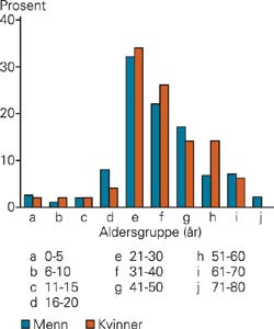 Av totalt 276 pasienter behandlet for etseskader i det aktuelle tidsrommet hadde 269 fullstendige opplysninger i journalene og kunne inkluderes i studien. Det var 180 (67 %) menn (median alder 34 år, variasjon 2 – 79 år) og 89 (33 %) kvinner (median alder 35 år, variasjon 1 – 69 år). Det var ingen aldersforskjell mellom de skadede kvinner og menn. Den største forekomsten av øyeskader var i aldersgruppen 21 – 30 år både for kvinner og menn, (32 % av skadene blant menn og 34 % blant kvinnene) (fig 1). Den største kjønnsvariasjonen forelå i aldersgruppen 16 – 20 år hvor etseskader forekom tre ganger så hyppig blant menn som blant kvinner, og i aldersgruppen 51 – 60 år, hvor det var dobbelt så mange skader blant kvinner som blant menn. I alt 11 (4 %) pasienter hadde også vært utsatt for etseskader på øyet også tidligere.