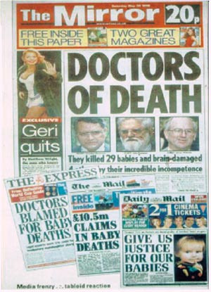 Figur 1 De britiske tabloidavisene ledet an i den offentlige oppvasken etter barnedødsfallene ved Bristol Royal Infirmary. Forsiden av The Mirror er fra 30.5. 1998, de andre er fra samme periode