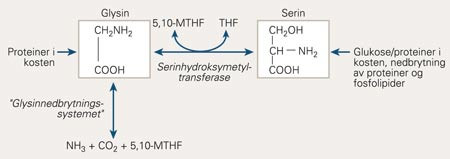 Glysinmolekylet er enkelt oppbygd (fig 1). Det eksisterer i likevekt med serin og kan dannes ved at betakarbonet i sidekjeden til serin blir overført til tetrahydrofolat. Reaksjonen katalyseres av enzymet serinhydroksymetyltransferase. Karbondioksid, ammoniakk og metylentetrahydrofolat er utgangspunkter for en alternativ syntesevei. Nedbrytningen styres delvis av glysindekarboksylase. Den sjeldne recessivt arvelige sykdommen ikke-ketotisk hyperglysinemi skyldes i de fleste tilfellene manglende eller nedsatt funksjon i dette enzymet. Økt konsentrasjon av glysin i sentralnervesystemet kan da gi livstruende nevrologiske forstyrrelser, generelle krampetilstander og mental retardasjon (1). Symptomene skyldes sannsynligvis overaktivering av N-methyl-D-aspartat (NMDA)-reseptorene.