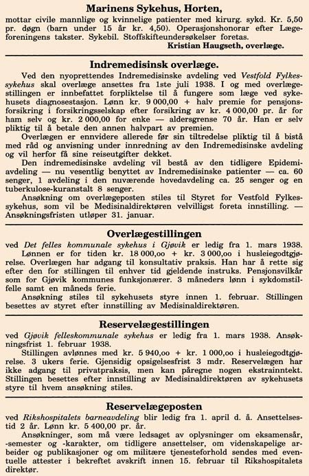 Tidligere i Tidsskriftet Stillingsannonser i 1938 () sporsmal_grey_rgb Artikkel For nesten 70 år siden hadde alle stillingsannonser samme utforming. Frynsegodene den gang var bolig, lys, varme og kost. Årslønnen for assistentleger var 3 000 – 4 000 kroner. Reservelegene tjente et par tusen mer. Kommentarer ( 0 ) Dette kommentarfeltet modereres, men kommentarer blir ikke redaksjonelt behandlet ut over å sikre at de følger retningslinjer for vårt kommentarfelt. Denne artikkelen ble publisert for mer enn 12 måneder siden, og vi har derfor stengt for nye kommentarer. Publisert: 18. mars 2004 Utgave 6, 18. mars 2004 Tidsskr Nor Lægeforen 18. mars 2004 124 : 891 Publisert: 18. mars 2004 Utgave 6, 18. mars 2004 Tidsskr Nor Lægeforen 2004 124 : 891 PDF Får du ikke vist PDF-filen eller vil lagre filen, kan du høyreklikke på PDF-ikonet. Velg «Lagre mål/fil som..» og hent så opp PDF-filen i for eksempel Acrobat Reader. Skriv ut Anbefalte artikler