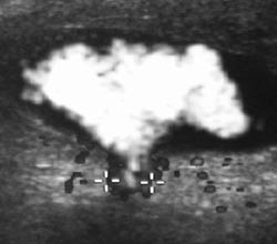 Aneurismet, aneurismehalsen og den punkterte arterien ble identifisert med ultralydundersøkelse og doppler (fig 1). Inklusjonskriteriene for behandlingen med trombin fremgår av tabell 2. Perifer puls ble sjekket før og etter behandling, eventuelt ble det utført en dopplerundersøkelse av arteriene på foten. Aneurismet ble punktert ultralydveiledet med en 20 G nål som var 15 cm lang. Målet var å plassere nålen i den sirkulerte del av aneurismet fra ventralsiden og på en slik måte at nålespissen pekte bort fra aneurismehalsen. Det ble ikke foretatt noen kompresjon. Med en 1 ml sprøyte ble trombin 1 000 IE/ml injisert (Trombostat, hetteglass med 5 000 IE). Ved pågående dopplerundersøkelse injiserte vi 0,1 ml om gangen inntil det var mulig å se at blodstrømmen i aneurismet ble opphevet (fig 2). Man satte en maks grense på 1 ml for aneurismer med bare ett lokulament, og 1,5 ml som øvre grense ved pseudoaneurismer med flere rom. Målet var å sette så lite trombin som mulig og å stoppe injeksjonen umiddelbart etter at blodstrømmen opphørte, noe som vanligvis tok få sekunder (fig 2). Undersøkelser har vist at aneurismehalsen lukkes spontant etter ca. ti minutter (3). Om man tilstreber å lukke også halsen, øker risikoen for å få trombin over i den native arterien. Etter behandlingen anbefalte vi sengeleie i to timer og pasienten kunne eventuelt utskrives samme dag. Ultralydkontroll ble utført neste dag hos de inneliggende pasientene og poliklinisk hos dem som var utskrevet. Pasientene ble ved ultralydkontrollen informert om å ta kontakt med oss, dersom de på ny skulle få symptomer fra punksjonsområdet. Det ble ikke gjort systematisk oppfølging av pasientene etter dette, da andre har vist at slik oppfølging ikke er nødvendig (3).