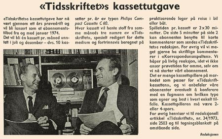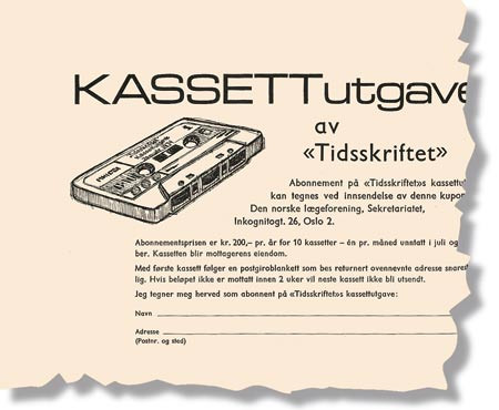 Tidligere i Tidsskriftet Fra Tidsskriftets kassettutgave til Manusnett () sporsmal_grey_rgb Artikkel For 30 år siden ble Tidsskriftets kassettutgave lansert, fortrinnsvis for praktiserende leger på reise i bil eller båt. Tidsskriftet lå langt fremme med dette avanserte abonnementstilbudet, og etter hvert ble det 300 – 400 som sendte inn kupongen. 1. april 2004 så Tidsskriftets Internett-baserte redaksjonelle system (www.manusnett.no) skjermens lys. På bildet fra Tidsskriftet nr. 1/1974, side 33 ses Einar Johannessen og tidligere redaktør Ole K. Harlem. Kommentarer ( 0 ) Dette kommentarfeltet modereres, men kommentarer blir ikke redaksjonelt behandlet ut over å sikre at de følger retningslinjer for vårt kommentarfelt. Denne artikkelen ble publisert for mer enn 12 måneder siden, og vi har derfor stengt for nye kommentarer. Publisert: 6. mai 2004 Utgave 9, 6. mai 2004 Tidsskr Nor Lægeforen 6. mai 2004 124 : 1347 Publisert: 6. mai 2004 Utgave 9, 6. mai 2004 Tidsskr Nor Lægeforen 2004 124 : 1347 PDF Får du ikke vist PDF-filen eller vil lagre filen, kan du høyreklikke på PDF-ikonet. Velg «Lagre mål/fil som..» og hent så opp PDF-filen i for eksempel Acrobat Reader. Skriv ut Anbefalte artikler