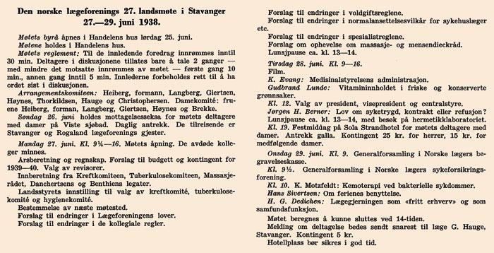 Tidligere i Tidsskriftet Program for landsmøtet i 1938 () sporsmal_grey_rgb Artikkel Legeforeningens landsmøte gikk også den gang over tre dager og hadde sosiale innslag, viser programmet hentet fra Tidsskriftet i 1938, s. 612 – 3. I dag har det faglige måttet vike til fordel for fagforeningsspørsmål. Et av foredragene i 1938 var Vitamininnholdet i friske og konserverte grønnsaker. Kommentarer ( 0 ) Dette kommentarfeltet modereres, men kommentarer blir ikke redaksjonelt behandlet ut over å sikre at de følger retningslinjer for vårt kommentarfelt. Denne artikkelen ble publisert for mer enn 12 måneder siden, og vi har derfor stengt for nye kommentarer. Publisert: 20. mai 2004 Utgave 10, 20. mai 2004 Tidsskr Nor Lægeforen 20. mai 2004 124 : 1491 Publisert: 20. mai 2004 Utgave 10, 20. mai 2004 Tidsskr Nor Lægeforen 2004 124 : 1491 PDF Får du ikke vist PDF-filen eller vil lagre filen, kan du høyreklikke på PDF-ikonet. Velg «Lagre mål/fil som..» og hent så opp PDF-filen i for eksempel Acrobat Reader. Skriv ut Anbefalte artikler