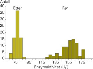 I Norge ble referanseintervallene for sju enzymer (ALP, alaninaminotransferase (ALT), aspartataminotransferase (AST), gammaglutamyltransferase (GT), LD, amylase og pancreasamylase) tatt i bruk mai 2003 (4). Samtidig tok man i bruk internasjonalt anbefalte målemetoder for ALP, LD, amylase og pancreasamylase. Dette førte umiddelbart til en samling hva angår nivået på disse komponenter, som vist i figur 1 for ALP. De foreslåtte referanseintervallene for det siste enzymet (kreatinkinase, CK) samt for de øvrige 17 komponentene er anbefalt tatt i bruk i løpet av våren 2004. Forut for dette vil det enkelte laboratorium analysere kalibratorer med kjente verdier for å sikre at målemetodene ligger på riktig nivå (2). Det er en forutsetning for å kunne benytte de nye referanseintervallene.
