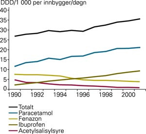 Omsetningen av analgetika som vesentlig selges uten resept har i undersøkelsesperioden vært svakt stigende. Paracetamol har i hele perioden vært det mest solgte analgetikum. Salget av ibuprofen har økt, mens salget av acetylsalisylsyre og fenazon har hatt en nedgang (fig 1). Mesteparten selges i reseptfrie pakninger. Det totale salget av lette analgetika og ibuprofen var i 1990 27 DDD/1 000 innbyggere/døgn og i 2001 36 DDD/1 000 innbyggere/døgn. Denne økningen i analgetikasalget skyldes først og fremst en 75 % økning i salget av paracetamol i samme periode, fra 12 til 21 DDD/1 000 innbyggere/døgn. Paracetamolsalget i 2001 tilsvarte 46 tabletter/innbygger/år.