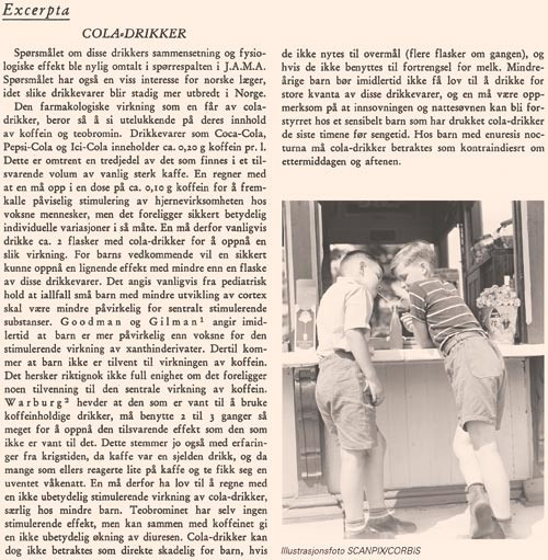 Tidligere i Tidsskriftet Coladrikker – før og nå () sporsmal_grey_rgb Artikkel I Tidsskriftet i 1955 (nr. 13/14 side 499) var man opptatt av koffeininnholdet i coladrikkene og hvilken påvirkning dette hadde på barn. I dag er vi mer bekymret for hvor mye sukker barna får i seg når de drikker brus. Kommentarer ( 0 ) Dette kommentarfeltet modereres, men kommentarer blir ikke redaksjonelt behandlet ut over å sikre at de følger retningslinjer for vårt kommentarfelt. Denne artikkelen ble publisert for mer enn 12 måneder siden, og vi har derfor stengt for nye kommentarer. Publisert: 17. juni 2004 Utgave 12, 17. juni 2004 Tidsskr Nor Lægeforen 17. juni 2004 124 : 1739 Publisert: 17. juni 2004 Utgave 12, 17. juni 2004 Tidsskr Nor Lægeforen 2004 124 : 1739 PDF Får du ikke vist PDF-filen eller vil lagre filen, kan du høyreklikke på PDF-ikonet. Velg «Lagre mål/fil som..» og hent så opp PDF-filen i for eksempel Acrobat Reader. Skriv ut Anbefalte artikler