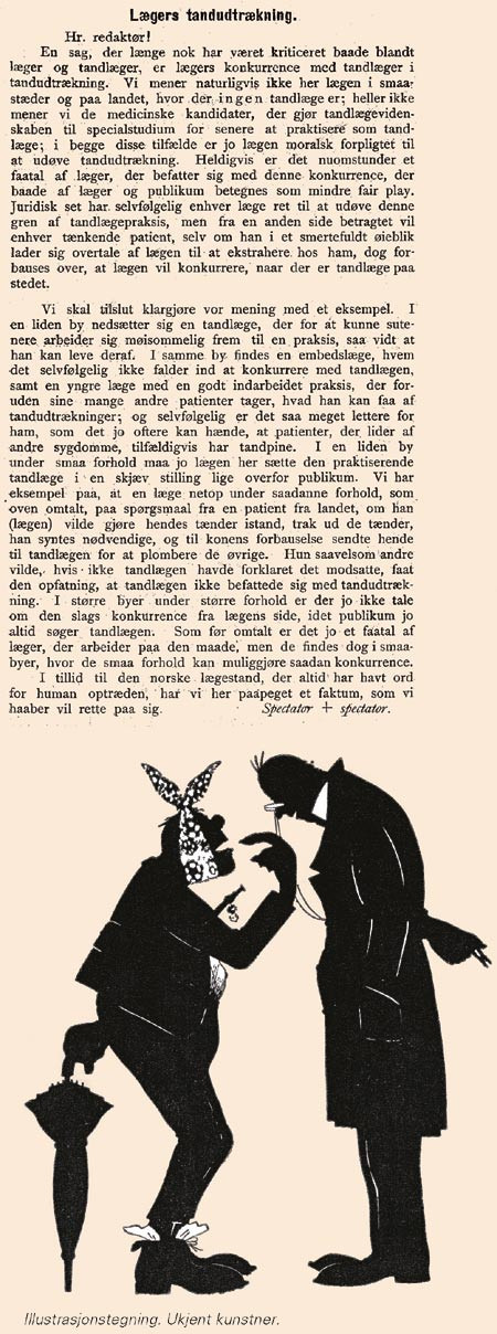 Tidligere i Tidsskriftet Tannløst i små byer () sporsmal_grey_rgb Artikkel Hvem skal trekke tenner? Leger eller tannleger? Kritikken i dette innlegget for 100 år siden retter seg mot leger som trekker tenner, og søker slik å ramme forholdet mellom tannlegene og pasientene. Det er bare i små byer at denne «konkurransen» om tanntrekking foregår. Dette kommer frem i Tidsskriftet nr. 2/1904 side 83 – 4. Kommentarer ( 0 ) Dette kommentarfeltet modereres, men kommentarer blir ikke redaksjonelt behandlet ut over å sikre at de følger retningslinjer for vårt kommentarfelt. Denne artikkelen ble publisert for mer enn 12 måneder siden, og vi har derfor stengt for nye kommentarer. Publisert: 3. juni 2004 Utgave 11, 3. juni 2004 Tidsskr Nor Lægeforen 3. juni 2004 124 : 1603 Publisert: 3. juni 2004 Utgave 11, 3. juni 2004 Tidsskr Nor Lægeforen 2004 124 : 1603 PDF Får du ikke vist PDF-filen eller vil lagre filen, kan du høyreklikke på PDF-ikonet. Velg «Lagre mål/fil som..» og hent så opp PDF-filen i for eksempel Acrobat Reader. Skriv ut Anbefalte artikler