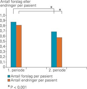 Figur 1 viser at det gjennomsnittlige antall forslag til endringer fra farmasøyten sank fra 0,87/pasient i første periode til 0,68/pasient i andre periode (p < 0,001). Samtidig sank det gjennomsnittlige antall endringer i forskrivning av legemidler som følge av farmasøytens forslag fra 0,81/pasient i første periode til 0,57/pasient i andre periode (p < 0,001). Khikvadrattest viser i tillegg en signifikant forskjell (p = 0,009) i andel av farmasøytens forslag som ble tatt til følge i første periode (94 %) sammenliknet med andre periode (83 %).