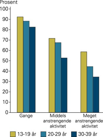 Gjennomsnittsalderen i hele utvalget var 27 år og gjennomsnittlig kroppsmasseindeks (BMI) var 23,3 kg/m². Totalt aktivitetsnivå (min/uke) ble redusert med økende alder (p < 0,05) (tab 1). Andelen som drev med gangaktivitet, middels anstrengende aktivitet og meget anstrengende aktivitet sank med økende alder (fig 1).