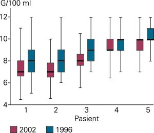 Siden median hemoglobinverdi ligger 1 g lavere i fire av de fem eksemplene, sammenliknet med 1996, må denne forskjellen betraktes som klinisk relevant.